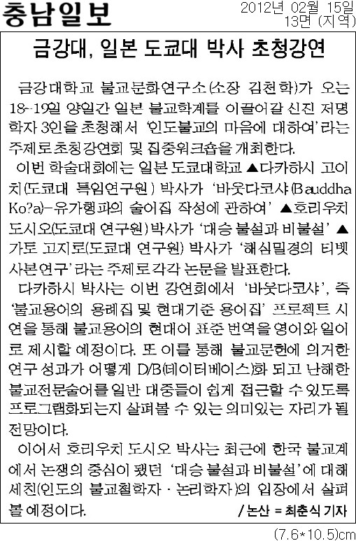 | [충남일보] 2012년 2월 15일 "금강대, 일본 도쿄대 박사 초청강연" | |||