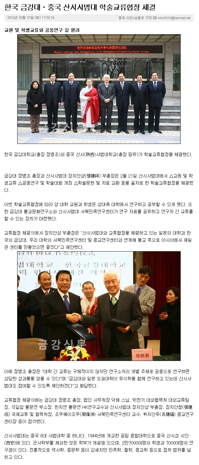 | [금강신문] 2012년 2월 21일 "한국 금강대·중국 산시사범대 학술교류협정 체결" | |||